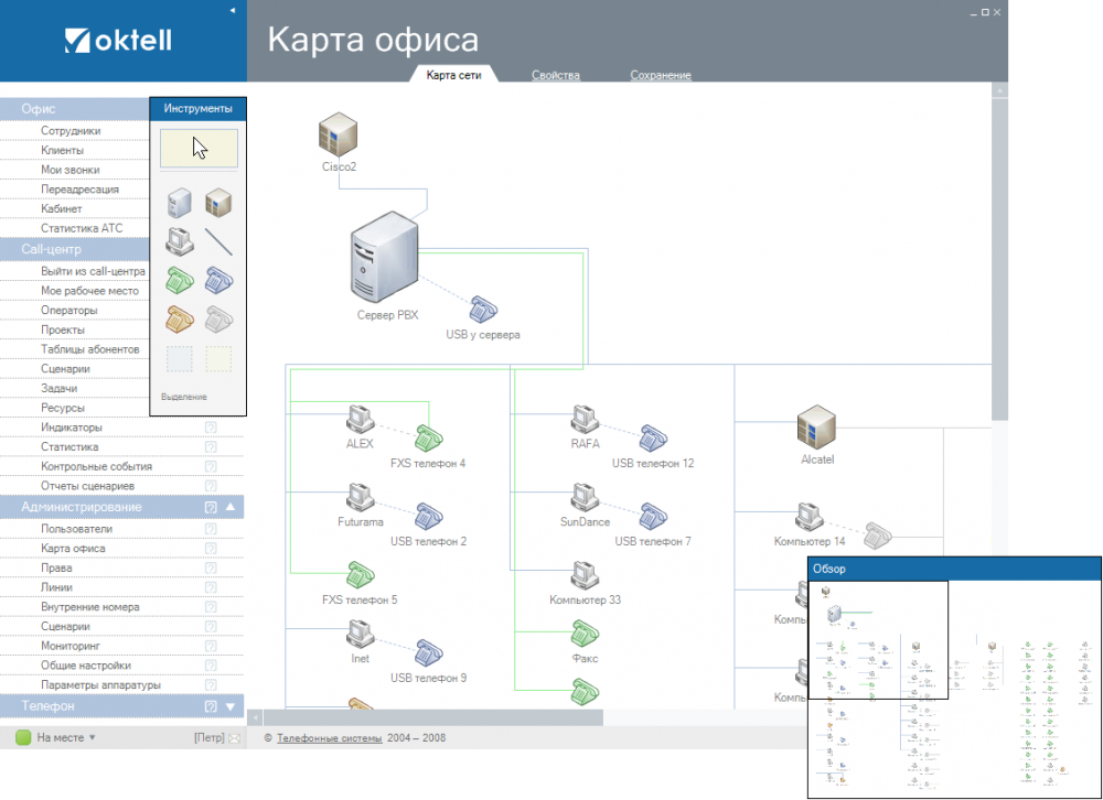 Создание карты происходит в графической оболочке системы Oktell, которая состоит из 2 основных элементов управления: